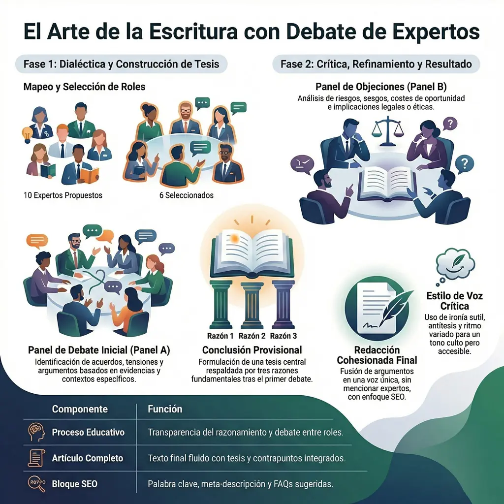 - El artículo final debe ser cohesionado en una sola voz, sin mencionar roles/disciplinas/“expertos”.